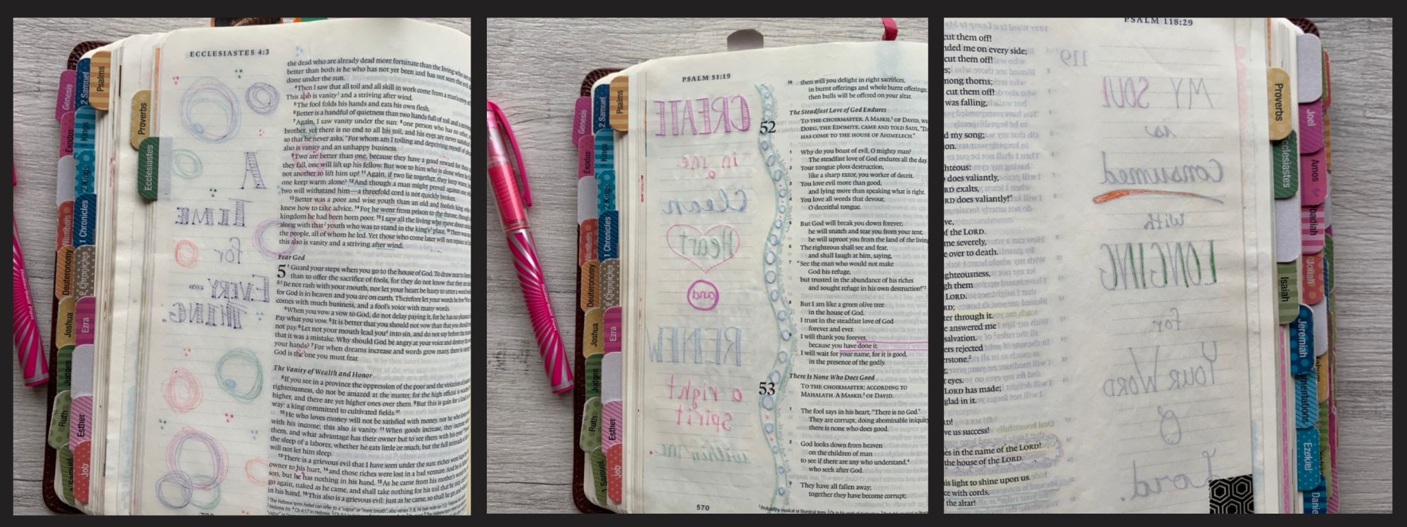 I had been taking notes and making doodles in the margins of my Bible since I was a teenager, but when I discovered there were other people creating art in their Bibles—and that there were wide-margin Bibles designed specifically for writing—I was hooked!
